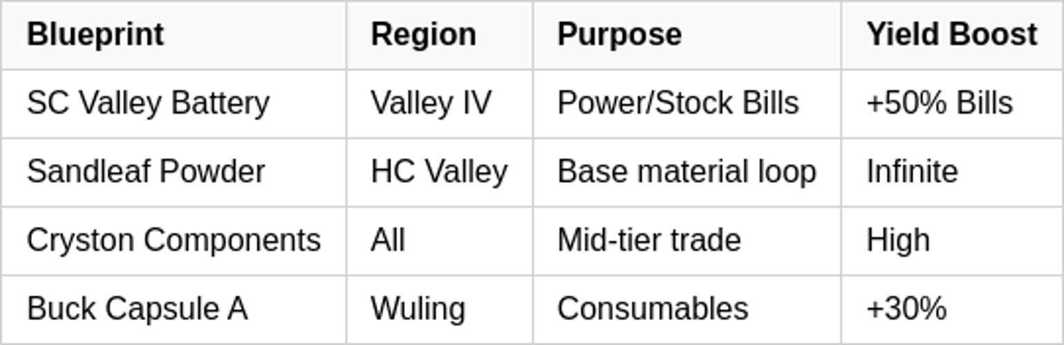Prioritize acquiring the most efficient blueprints available in the early to mid-game