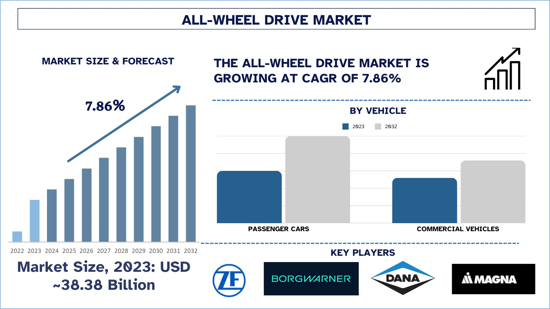 According to a new report by UnivDatos, the All-wheel Drive market is expected to reach USD Billion in 2032 by growing at a CAGR of 7.86% DURING the forecast period (2024-2032).
