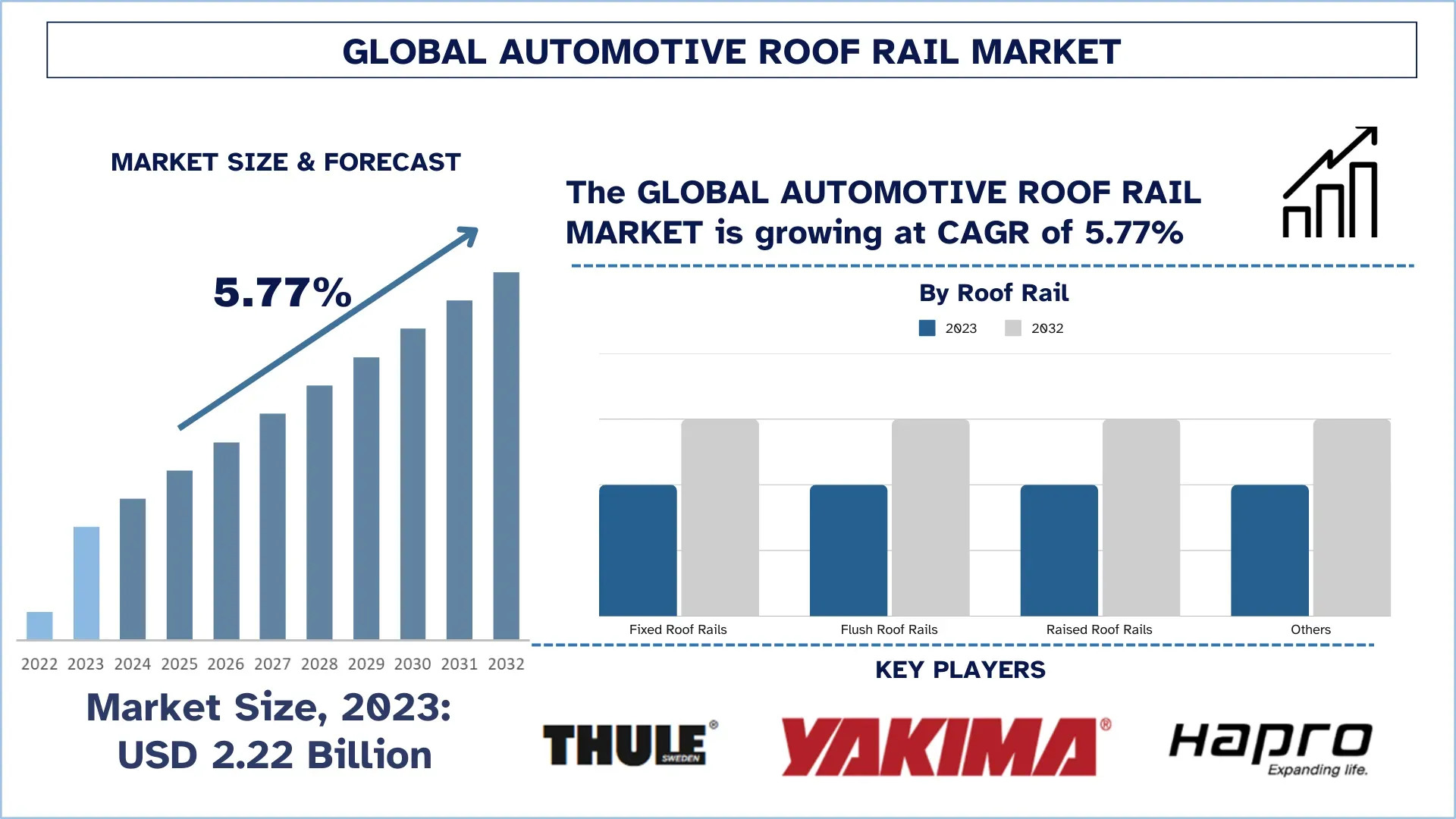 According to the UnivDatos, as per their Automotive Roof Rail Market report, the global market was valued at USD billion in 2023, growing at a CAGR of about 5.77% during the forecast period from 2024-2032 to reach USD 3.67 billion by 2032.