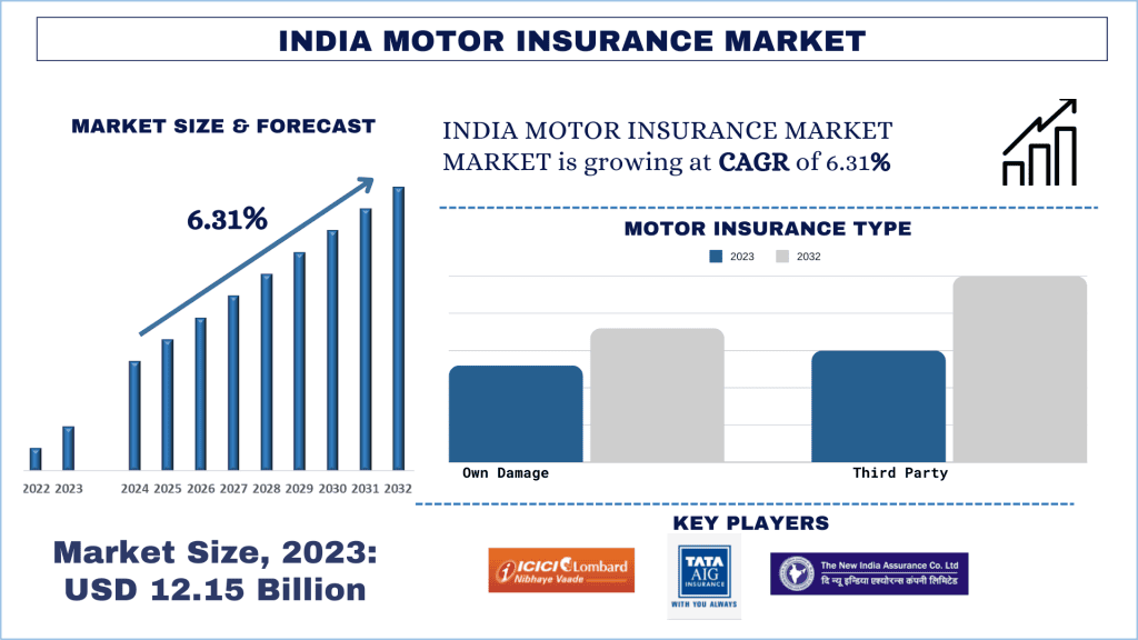 The India Motor Insurance Market was valued at USD 12.15 billion in 2023 and is expected to grow at a strong CAGR of around 6.31% during the forecast period (2024-2032).