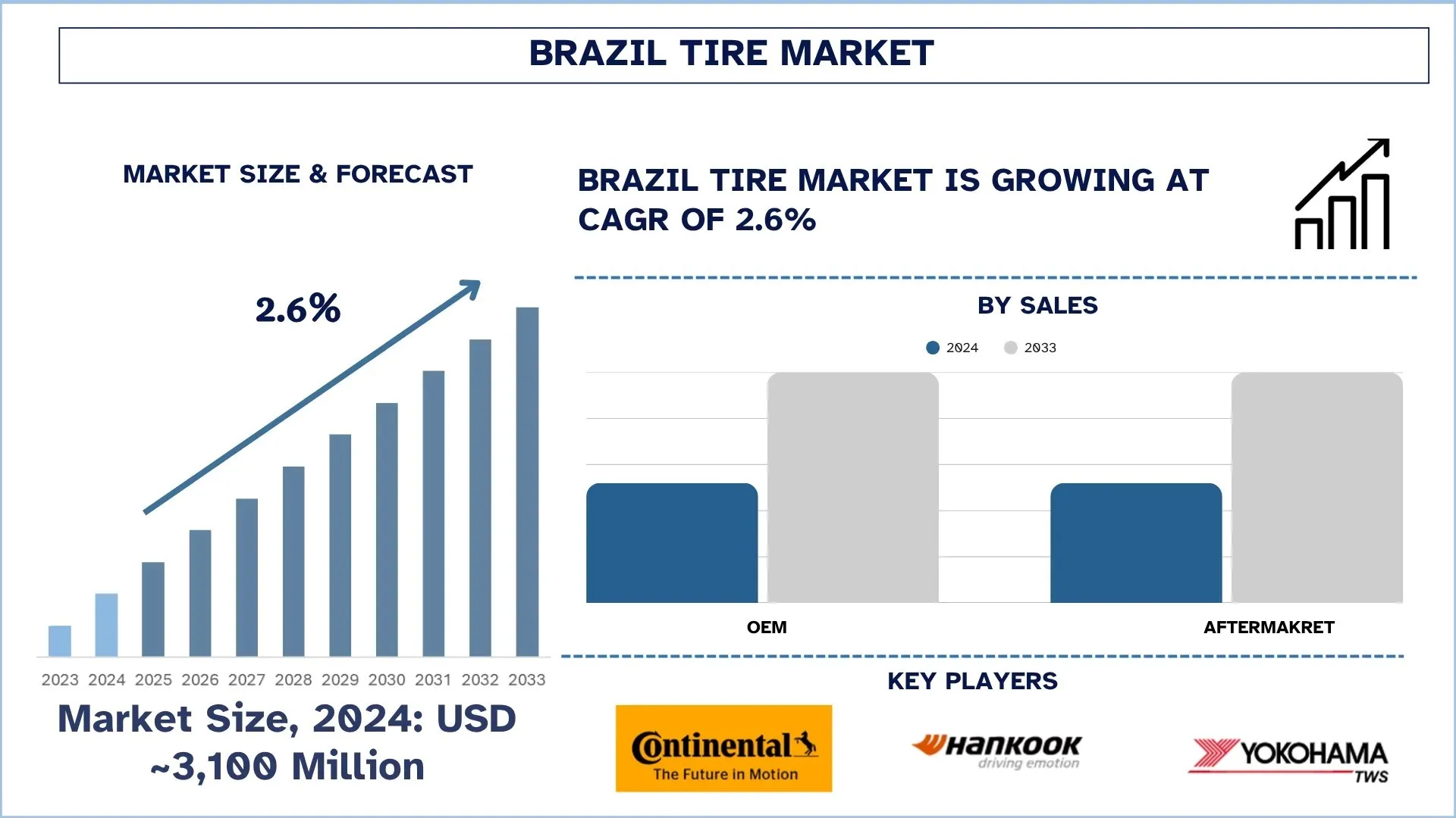 The Brazil Tire Market was valued at USD 3,100 million in 2024 and is expected to grow at a strong CAGR of around 2.6% during the forecast period (2025-2033F), owing to the rising vehicle fleets.