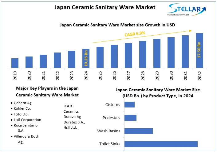 The Japan ceramic sanitary ware market was valued at USD 10.26 billion in 2024 and is projected to reach USD 17.50 billion by 2032, growing at a compound annual growth rate (CAGR) of 6.9% from 2025 to 2032.