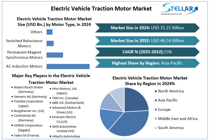 The global electric vehicle (EV) traction motor market was valued at USD 15.21 billion in 2024 and is projected to reach USD 46.54 billion by 2032, growing at a compound annual growth rate (CAGR) of 15% from 2025 to 2032.