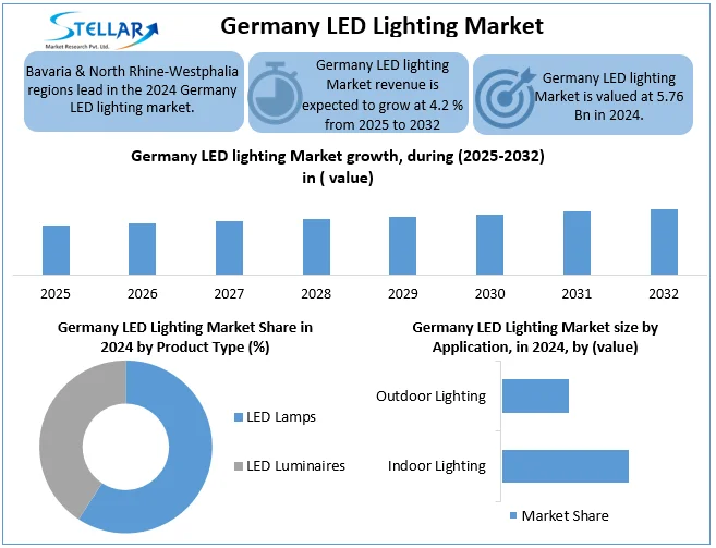 The LED lighting market in Germany covers the production, distribution and consumption of lighting solutions based on light-emitting diodes (LEDs) — including lamps (bulbs) and luminaires (fixtures) used in residential, commercial, industrial and outdoor applications. According to the report, the Germany LED lighting market was valued at approximately USD 5.76 billion in 2024 and is projected to grow to around USD 8.00 billion by 2032, representing a compound annual growth rate (CAGR) of about 4.2% over the 2025-2032 period.