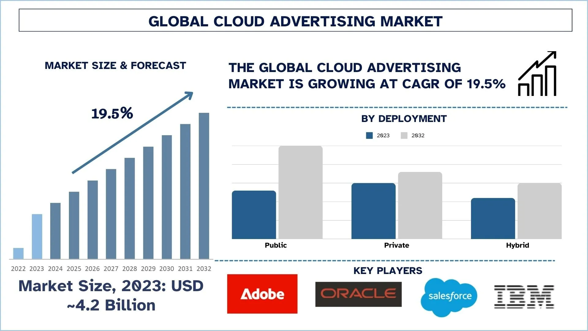 According to the UnivDatos, rising adoption of AI & machine learning, growing digital advertising spend, rising demand for customer-centric advertising, increasing mobile & social media usage, expansion of e-commerce & retail media networks drive the cloud advertising market. As per their “Cloud Advertising Market” report, the global Market was valued at USD 4.2 Billion in 2023, growing at a CAGR of about 19.5% during the forecast period from 2024 - 2032 to reach USD Billion by 2032.